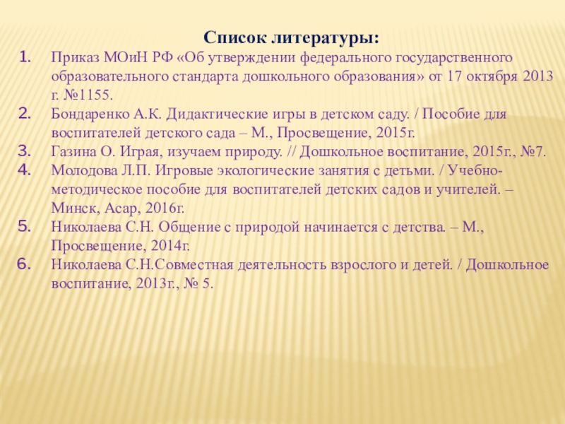 Молодова Л.П. Игровые экологические занятия с детьми. / Учебно-методическое пособие для воспитателей детских садов и учителей. – Минск, Асар, 2016г.