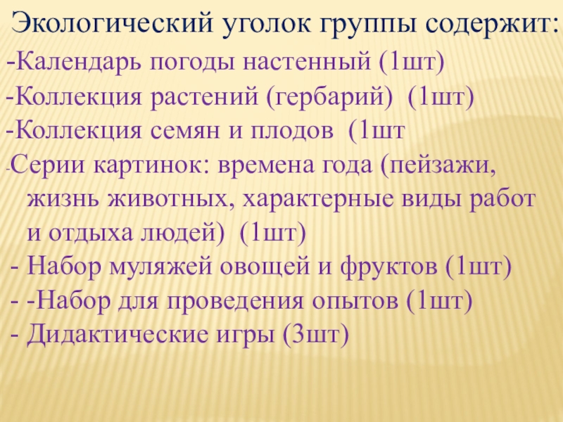 Слайд 14Экологический уголок группы содержит: