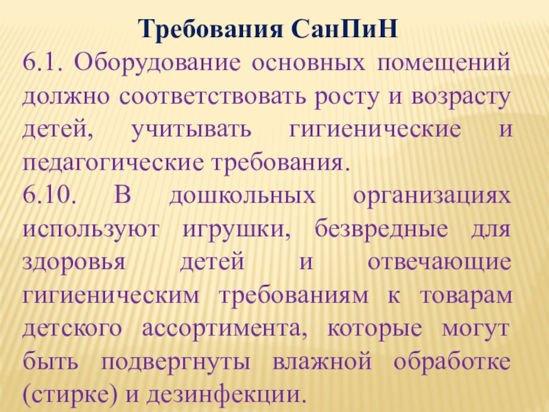 6.10. В дошкольных организациях используют игрушки, безвредные для здоровья детей и отвечающие гигиеническим требованиям к товарам детского ассортимента, которые могут быть подвергнуты влажной обработке (стирке) и дезинфекции.