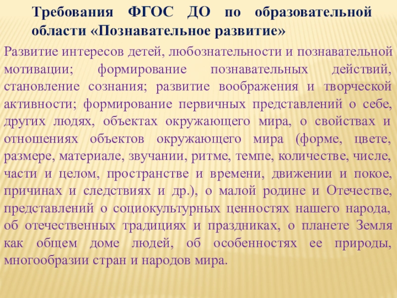 любознательности и познавательной мотивации; формирование познавательных действий, становление сознания; развитие воображения и творческой активности; формирование первичных представлений о себе, других людях, объектах окружающего мира, о свойствах и отношениях объектов окружающего мира (форме, цвете, размере, материале, звучании, ритме, темпе, количестве, числе, части и целом, пространстве и времени, движении и покое, причинах и следствиях и др.), о малой родине и Отечестве, представлений о социокультурных ценностях нашего народа, об отечественных традициях и праздниках, о планете Земля как общем доме людей, об особенностях ее природы, многообразии стран и народов мира.