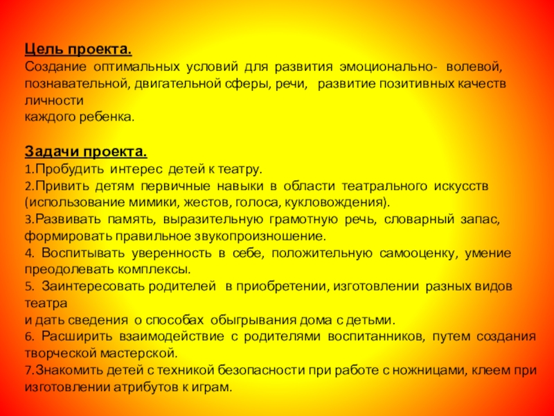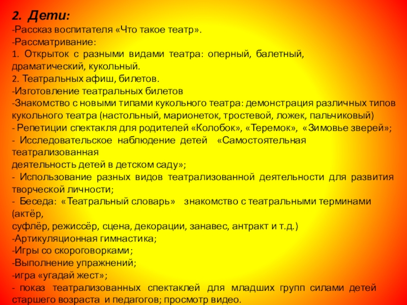 2.Привить детям первичные навыки в области театрального искусств