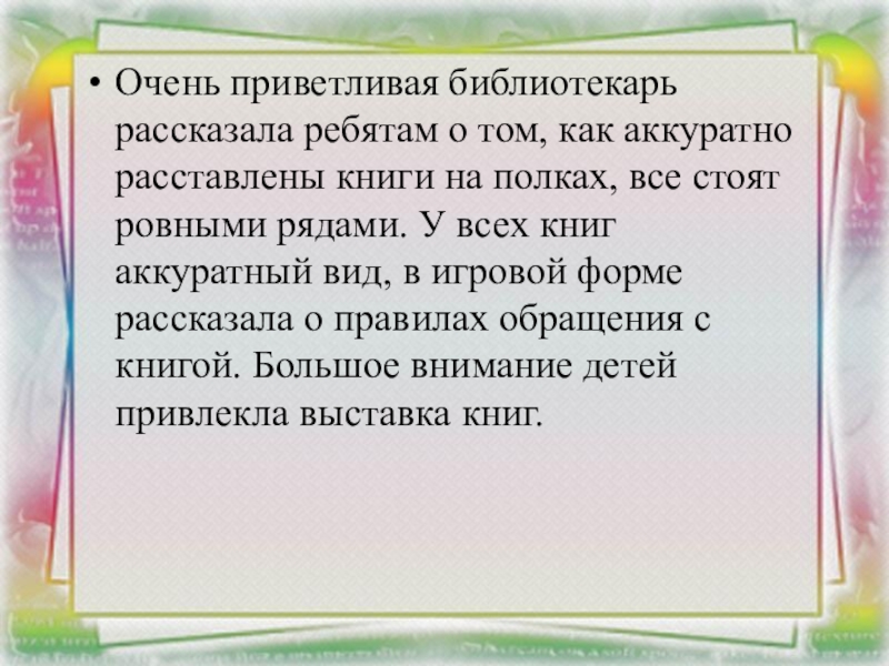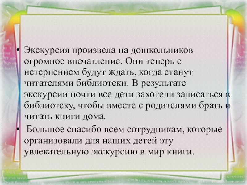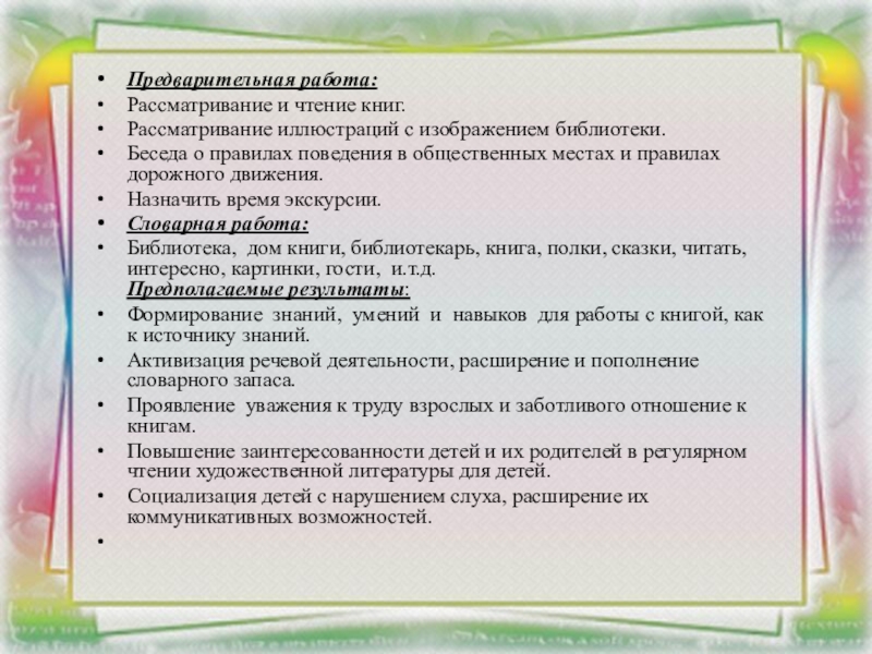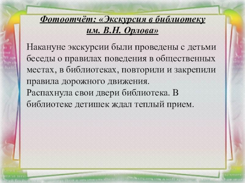 Накануне экскурсии были проведены с детьми беседы о правилах поведения в общественных местах, в библиотеках, повторили и закрепили правила дорожного движения.