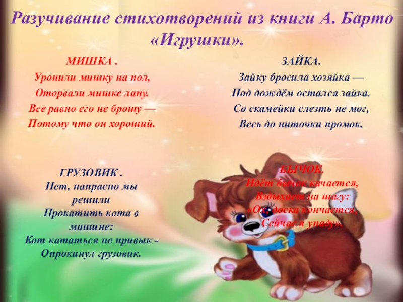 Разучивание стихотворений из книги А. Барто «Игрушки».