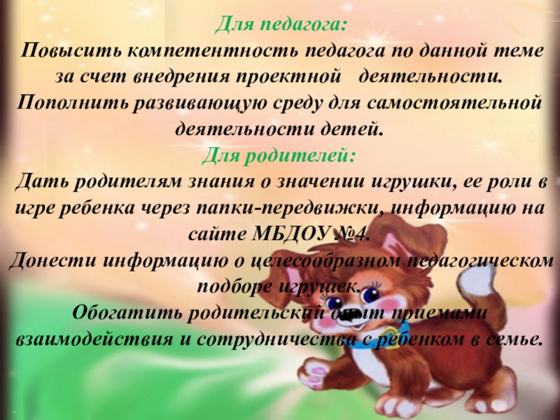 Дать родителям знания о значении игрушки, ее роли в игре ребенка через папки-передвижки, информацию на сайте МБДОУ №4.