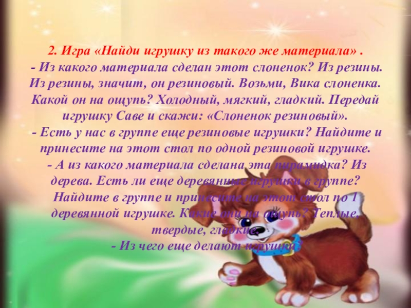 Слайд 152. Игра «Найди игрушку из такого же материала» .
