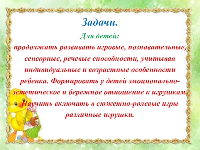 возрастные особенности ребенка. Формировать у детей эмоционально-эстетическое и бережное отношение к игрушкам. Научить включать в сюжетно-ролевые игры различные игрушки.