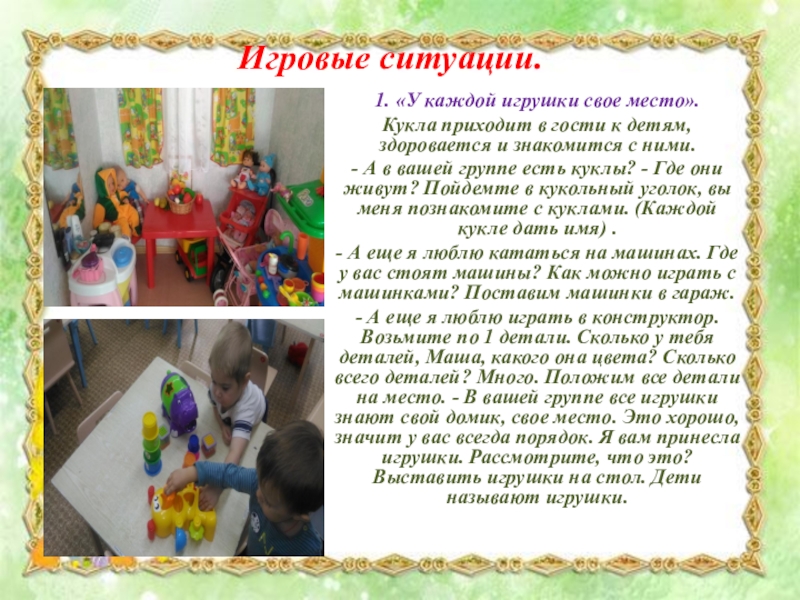 - А в вашей группе есть куклы? - Где они живут? Пойдемте в кукольный уголок, вы меня познакомите с куклами. (Каждой кукле дать имя) .
