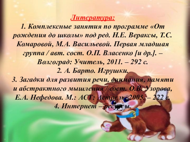 под ред. Н.Е. Вераксы, Т.С. Комаровой, М.А. Васильевой. Первая младшая группа / авт. сост. О.П. Власенко [и др.]. – Волгоград: Учитель, 2011. – 292 с.