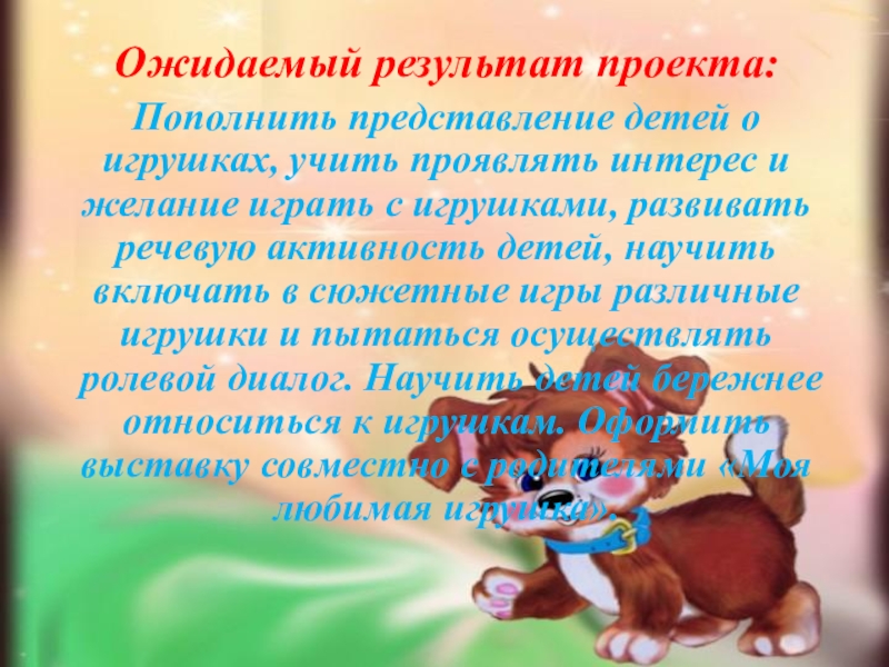 и желание играть с игрушками, развивать речевую активность детей, научить включать в сюжетные игры различные игрушки и пытаться осуществлять ролевой диалог. Научить детей бережнее относиться к игрушкам. Оформить выставку совместно с родителями «Моя любимая игрушка».