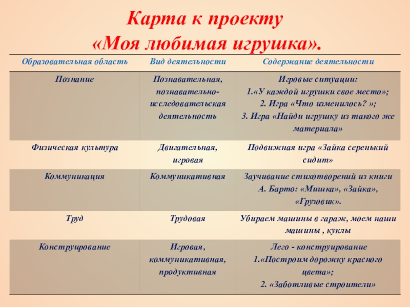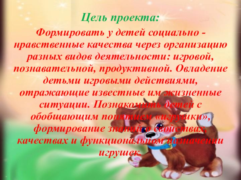 видов деятельности: игровой, познавательной, продуктивной. Овладение детьми игровыми действиями, отражающие известные им жизненные ситуации. Познакомить детей с обобщающим понятием «игрушки», формирование знаний о свойствах, качествах и функциональном назначении игрушек.