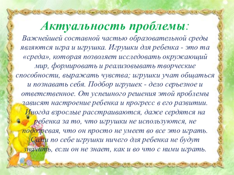 Важнейшей составной частью образовательной среды являются игра и игрушка.
