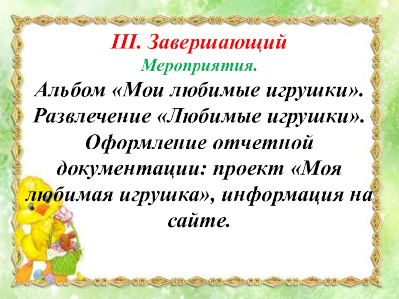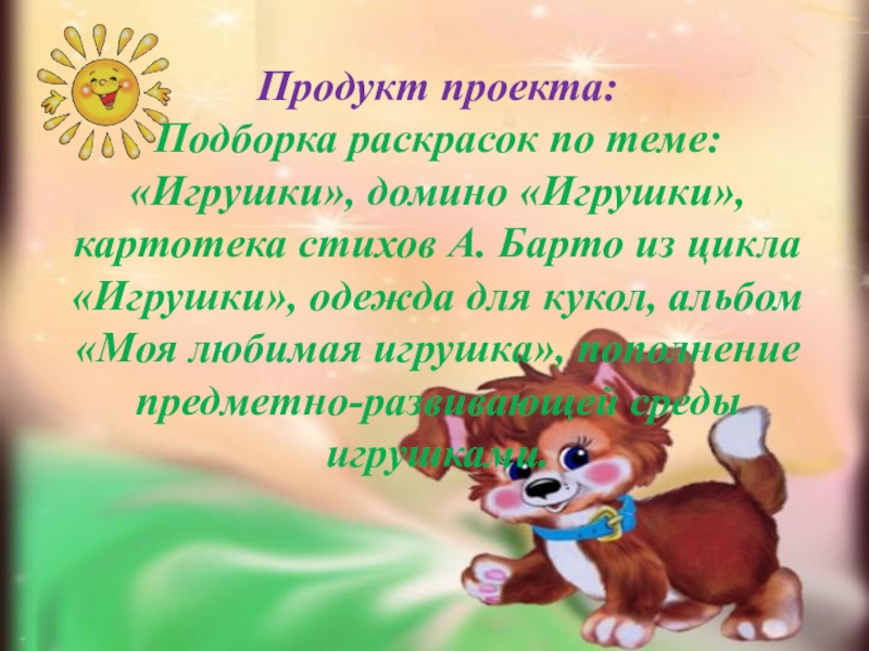 разные игрушки», «Магазин игрушек», «Из чего сделаны игрушки?». Выставка книг «Игрушки». Проведение дидактических игр: «Узнай на ощупь», «Один - много», «Найди по описанию», «Что изменилось?», «Найди игрушку такого же цвета», «Найди игрушку из такого же материала», «Чудесный мешочек». Рассматривание иллюстраций с изображением игрушек, рассматривание иллюстраций книг. ООД по лепке «Мяч». ООД по рисованию «Подарок для любимой игрушки». Игры с водой ( резиновые игрушки, «Пускаем бумажные кораблики»). Разучивание стихотворений А. Барто из цикла «Игрушки». Разучивание физминутки «Заводные игрушки». Проведение сюжетно-ролевых игр «Купание кукол», «Магазин игрушек». Прогулка. Выбираем игрушки для прогулки. Загадки об игрушках.