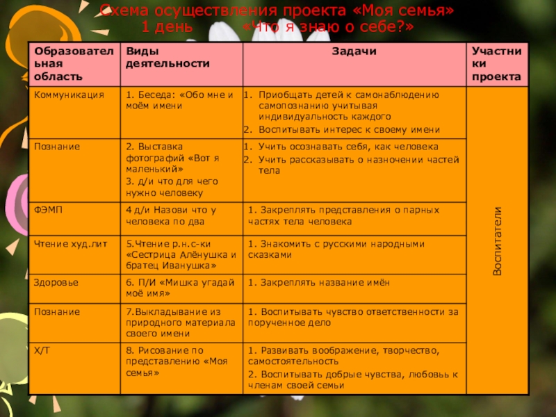 С целью изучения семьи, выяснения образовательных потребностей родителей, установления контакта с её членами, для согласования воспитательных воздействий на ребенка появилась идея: создать проект »Моя семья». Проведя, анкетирование среди детей – выяснилось, что не все дети знают о своей семье, кем работают их родители и бабушки с дедушками, мало кто из детей знает своё родословное, уходят в прошлое семейные праздники и традиции. Как изменить такое положение?
