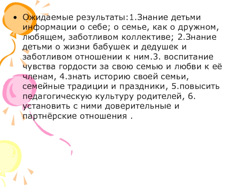 Ожидаемые результаты: воспитание чувства гордости за свою семью и любви к её членам, знать историю своей семьи, семейные традиции и праздники, повысить педагогическую культуру родителей, установить с ними доверительные и партнёрские отношения .