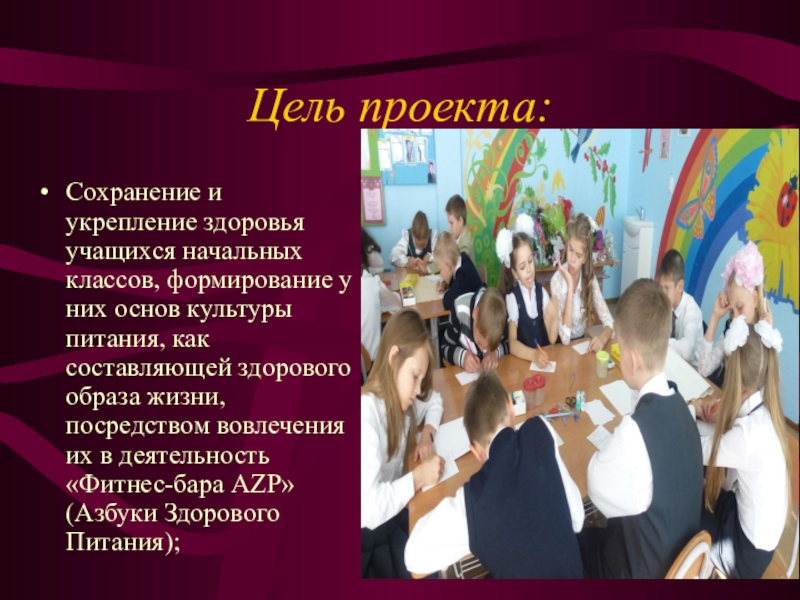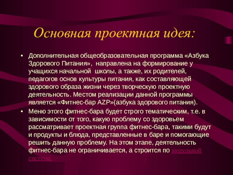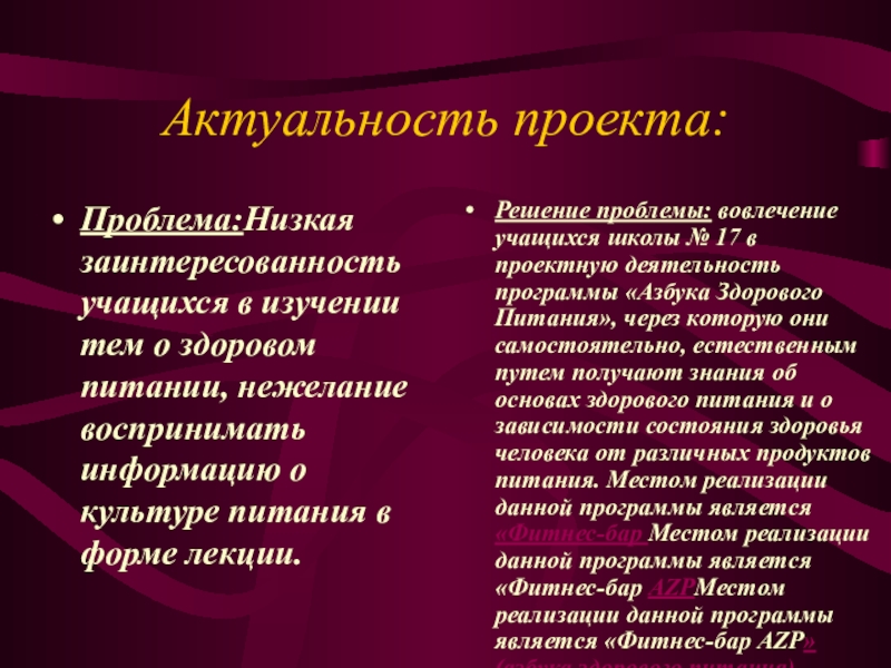 Решение проблемы: вовлечение учащихся школы № 17 в проектную деятельность программы «Азбука Здорового Питания», через которую они самостоятельно, естественным путем получают знания об основах здорового питания и о зависимости состояния здоровья человека от различных продуктов питания. Местом реализации данной программы является «Фитнес-бар Местом реализации данной программы является «Фитнес-бар AZPМестом реализации данной программы является «Фитнес-бар AZP»(азбука здорового питания).