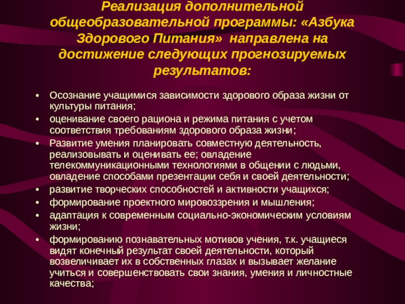 * расширение знаний учащихся о здоровом питании, направленном на сохранение и укрепление здоровья;