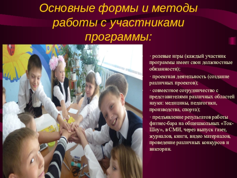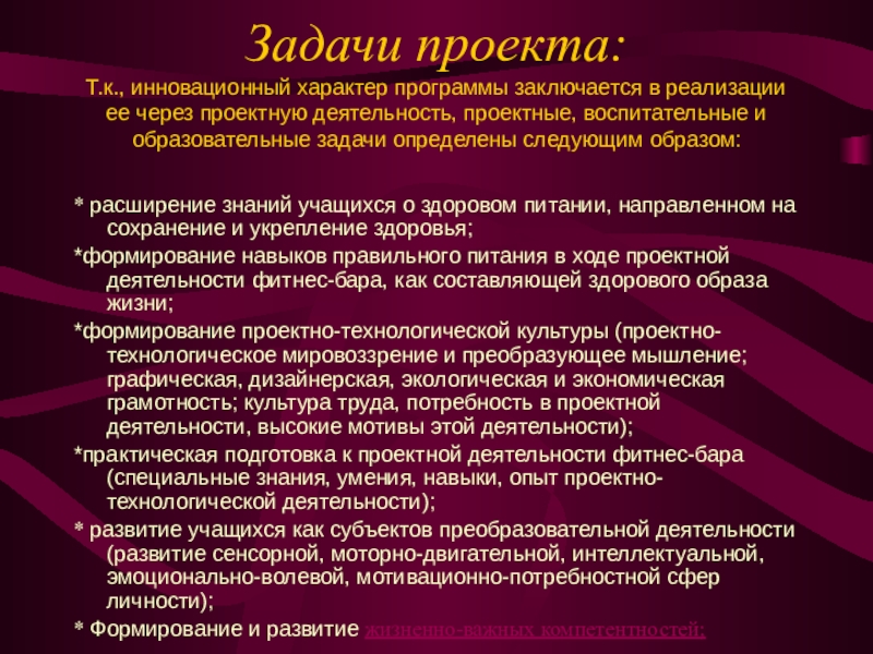 *формирование навыков правильного питания в ходе проектной деятельности фитнес-бара, как составляющей здорового образа жизни;