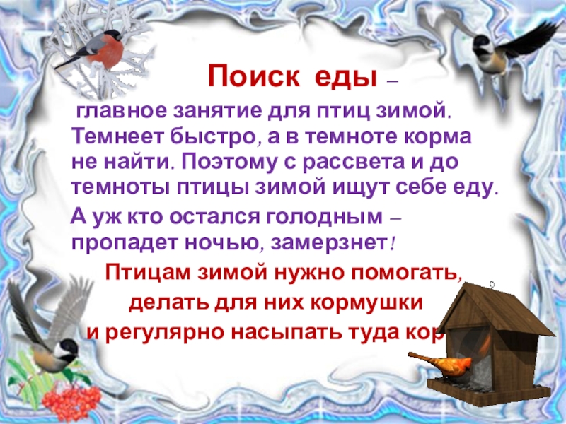 главное занятие для птиц зимой. Темнеет быстро, а в темноте корма не найти. Поэтому с рассвета и до темноты птицы зимой ищут себе еду.