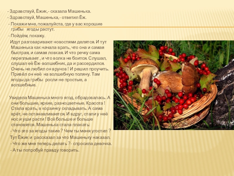 Идут разговаривают новостями делятся. И тут Машенька как начала врать, что она и самая быстрая, и самая ловкая. И что речку сама переплывает , и что волка не боится. Слушал, слушал её Ёж-волшебник, да и рассердился. Очень не любил он врунов ! И решил проучить. Привёл он неё на волшебную поляну. Там ягоды да грибы росли не простые, а волшебные.