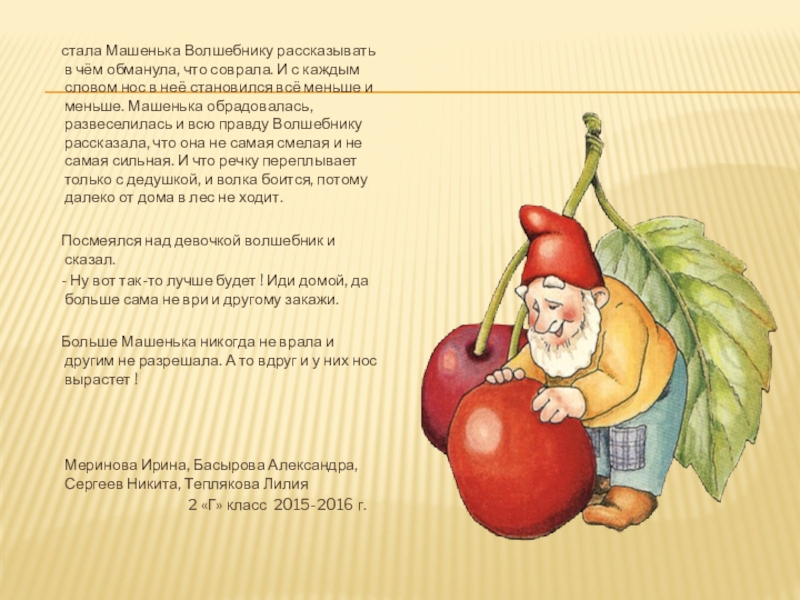 Больше Машенька никогда не врала и другим не разрешала. А то вдруг и у них нос вырастет !