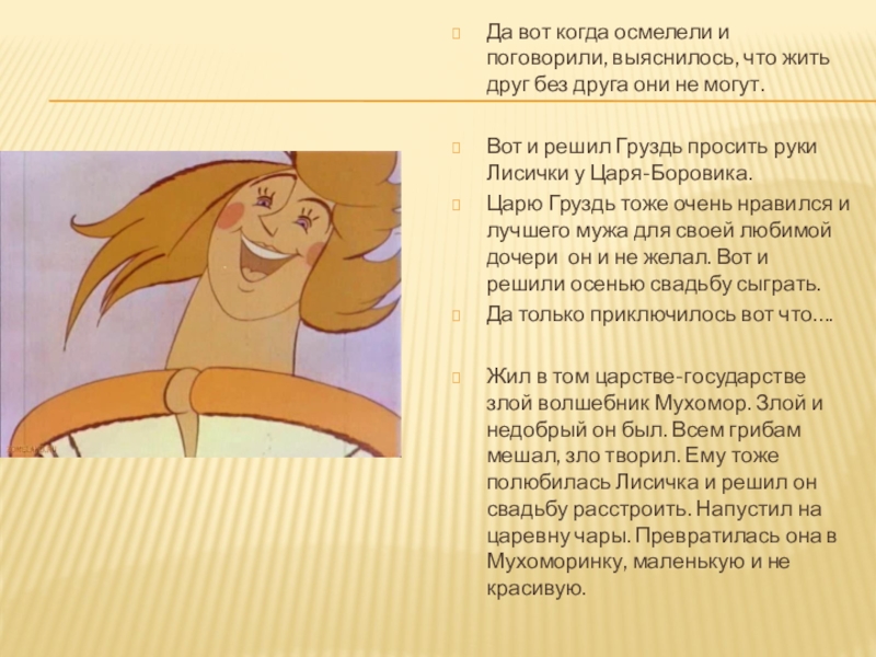 Вот и решил Груздь просить руки Лисички у Царя-Боровика.