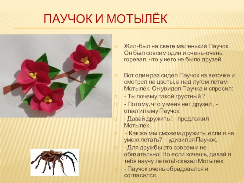 Вот один раз сидел Паучок на веточке и смотрел на цветы, а над лугом летам Мотылёк. Он увидел Паучка и спросил: