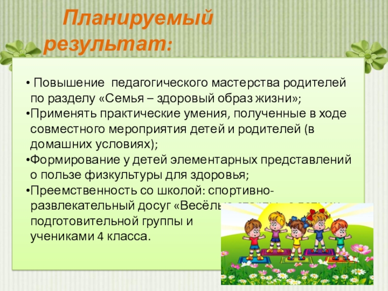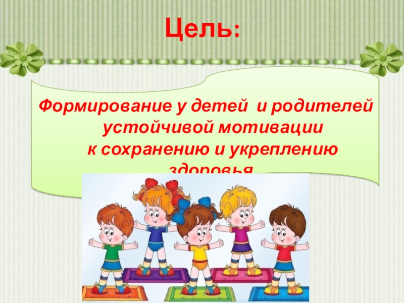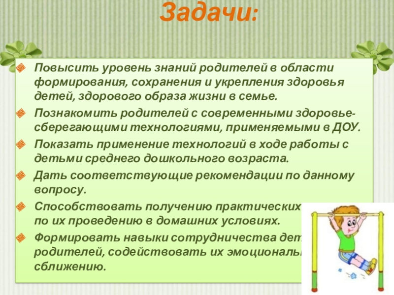 Повысить уровень знаний родителей в области формирования, сохранения и укрепления здоровья
