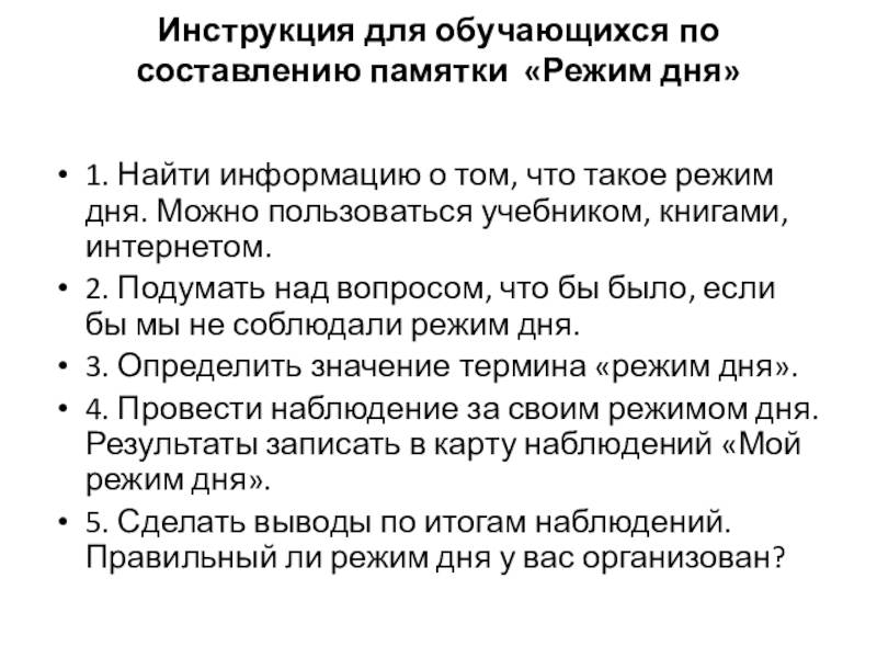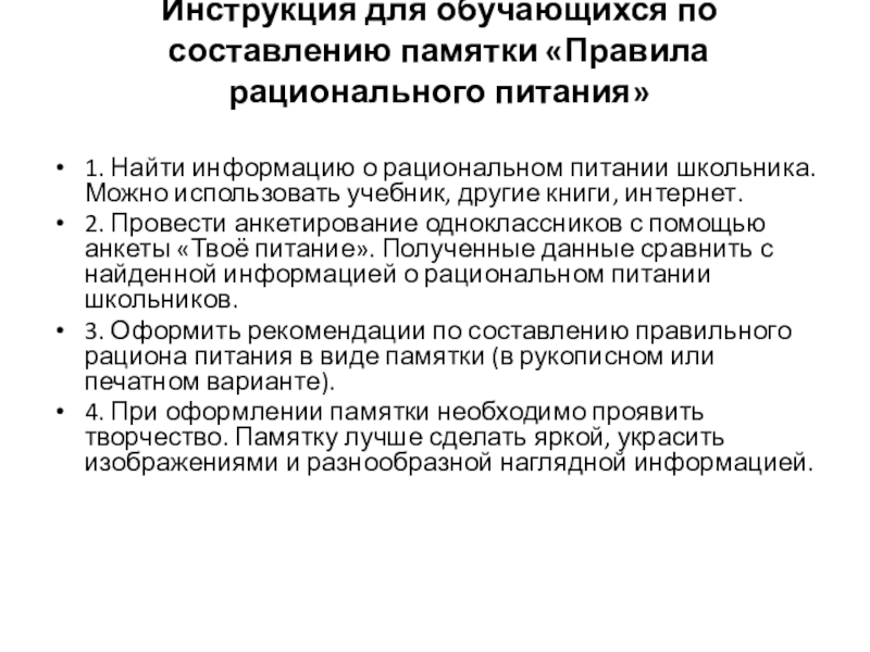 Слайд 25Инструкция для обучающихся по составлению памятки «Правила рационального питания»