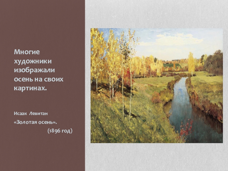 Многие художники изображали осень на своих картинах. Исаак Левитан«Золотая осень».(1896 год)