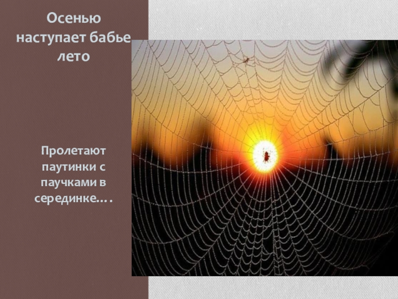 Осенью наступает бабье летоПролетают паутинки с паучками в серединке….