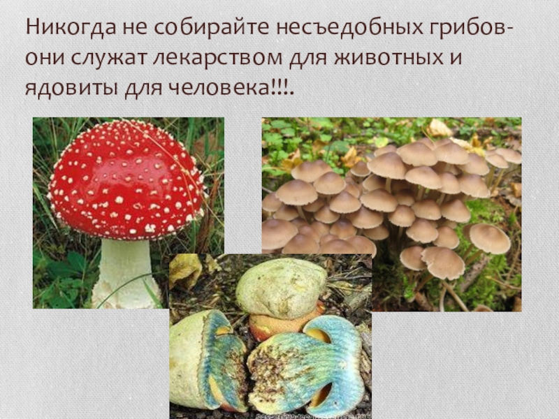 Слайд 7Никогда не собирайте несъедобных грибов- они служат лекарством для животных и