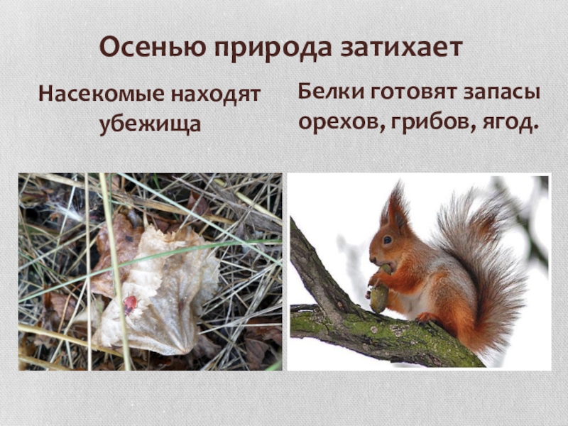 Осенью природа затихаетНасекомые находят убежищаБелки готовят запасы орехов, грибов, ягод.
