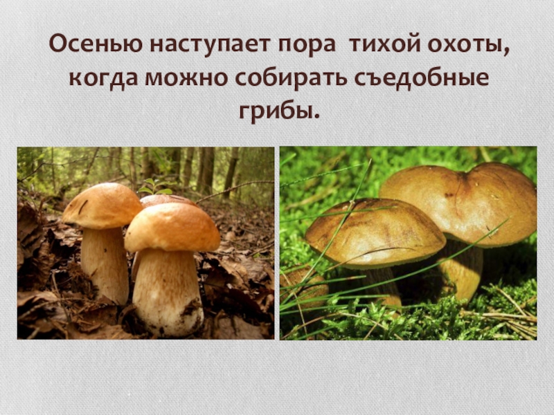 Слайд 6Осенью наступает пора тихой охоты, когда можно собирать съедобные грибы.