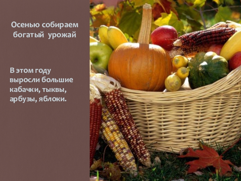 Осенью собираем богатый урожайВ этом году выросли большие кабачки, тыквы, арбузы, яблоки.