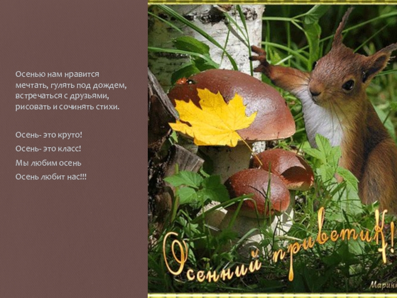 Осенью нам нравится мечтать, гулять под дождем, встречаться с друзьями, рисовать и сочинять стихи. Осень- это круто!