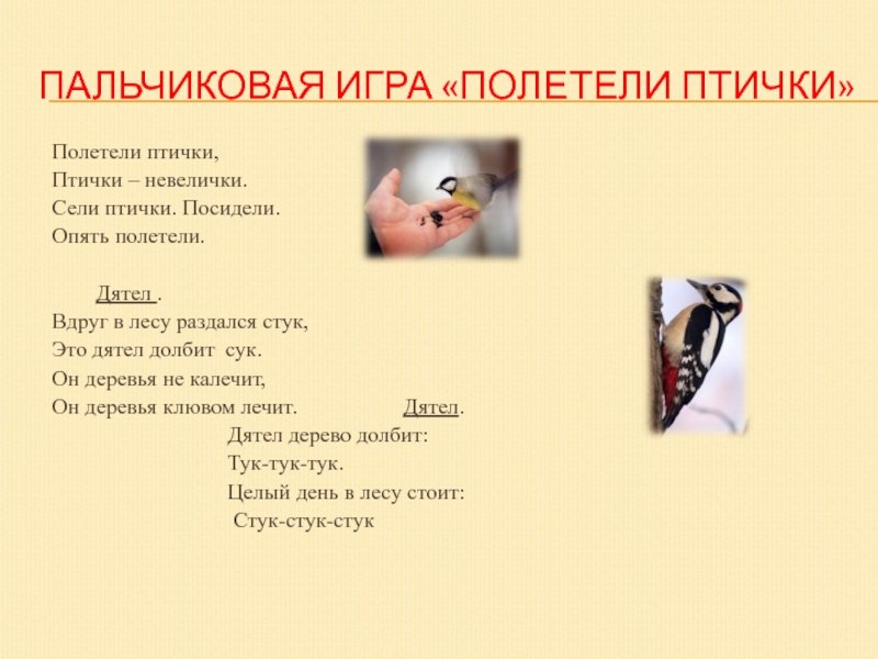 Слайд 26ПАЛЬЧИКОВАЯ ИГРА «ПОЛЕТЕЛИ ПТИЧКИ»