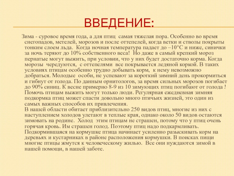 птиц самая тяжелая пора. Особенно во время снегопадов, метелей, морозов и после оттепелей, когда ветки и стволы покрыты тонким слоем льда. Когда ночная температура падает до –10°С и ниже, синички за ночь теряют до 10% собственного веса! Но даже в самый крепкий мороз пернатые могут выжить, при условии, что у них будет достаточно корма. Когда морозы чередуются, с оттепелями все покрывается ледяной коркой. В таких условиях птицам особенно трудно добывать корм, к нему невозможно добраться. Молодые особи, не успевают за короткий зимний день прокормиться и гибнут от голода. По данным орнитологов, за время сильных морозов погибает до 90% синиц. К весне примерно 8-9 из 10 зимующих птиц погибают от голода ! Помочь птицам выжить могут только люди. Регулярная ежедневная зимняя подкормка птиц может спасти довольно много птичьих жизней, это один из самых важных способов их привлечения. В нашей области обитает приблизительно 250 видов птиц, многие из них с наступлением холодов улетают в теплые края, однако около 50 видов остаются зимовать на родине. Холод этим птицам не страшен, потому что у птиц очень горячая кровь. Им страшен голод. Поэтому птиц надо подкармливать. Подкормившаяся на кормушке птица начинает усиленно разыскивать корм на деревьях и кустарниках в районе расположения кормушки. В поисках пищи многие птицы жмутся к человеческому жилью. Все они нуждаются зимой в нашей помощи, в нашей заботе.