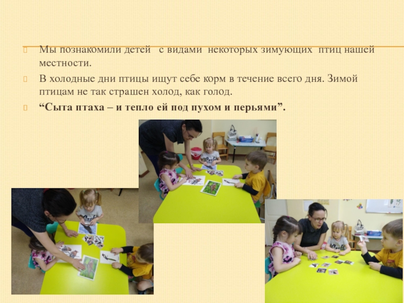 Мы познакомили детей с видами некоторых зимующих птиц нашей местности.