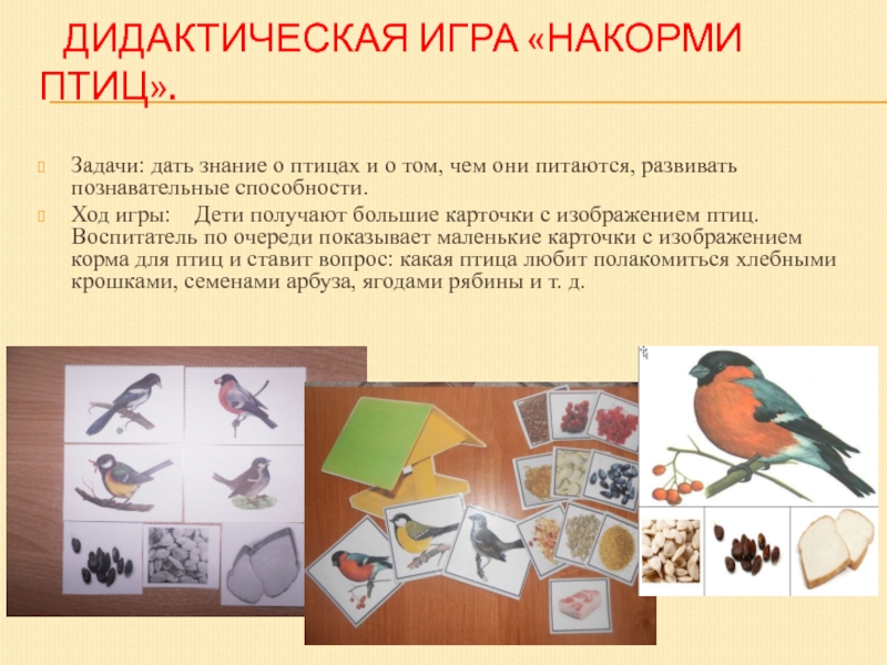Закрепить представления дошкольников о зимующих птицах, их образе жизни, о связи с окружающей средой, роли человека в жизни птиц.