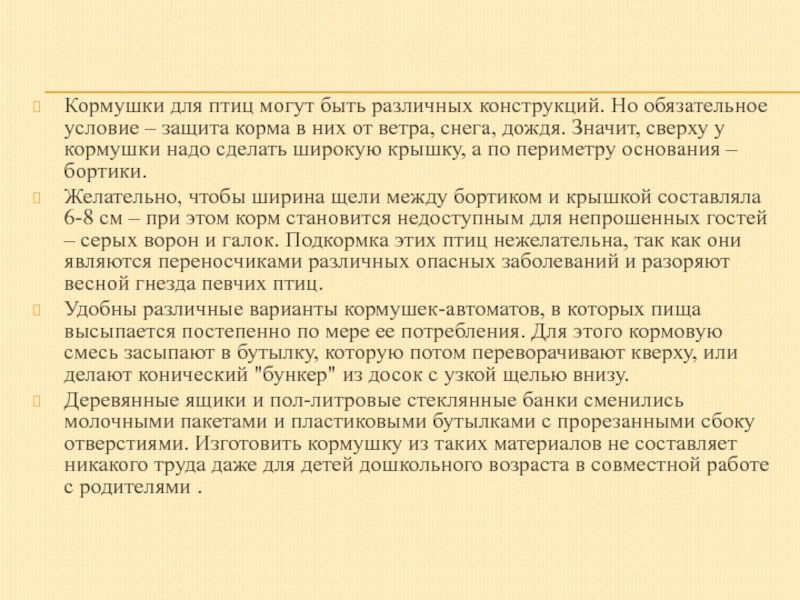 Кормушки для птиц могут быть различных конструкций. Но обязательное условие –