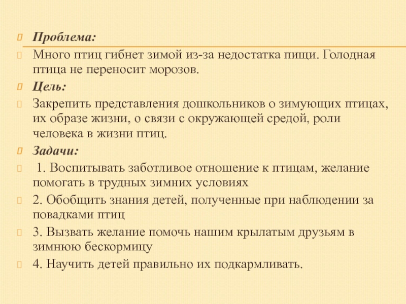 1. Воспитывать заботливое отношение к птицам, желание помогать в трудных зимних условиях