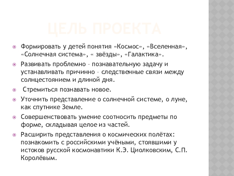 Расширить представления о космических полётах: познакомить с российскими учёными, стоявшими у истоков русской космонавтики К.Э. Циолковским, С.П. Королёвым.