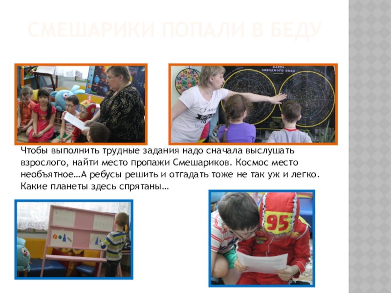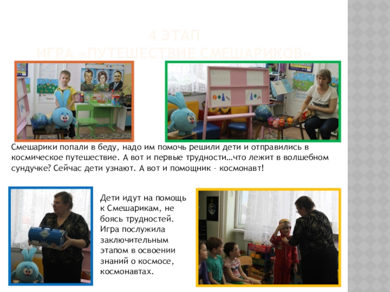 Дети идут на помощь к Смешарикам, не боясь трудностей. Игра послужила заключительным этапом в освоении знаний о космосе, космонавтах.