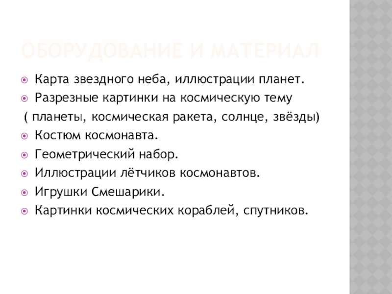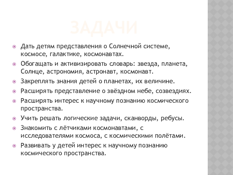 Дать детям представления о Солнечной системе, космосе, галактике, космонавтах.