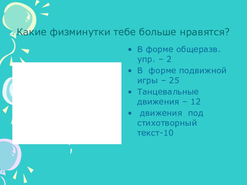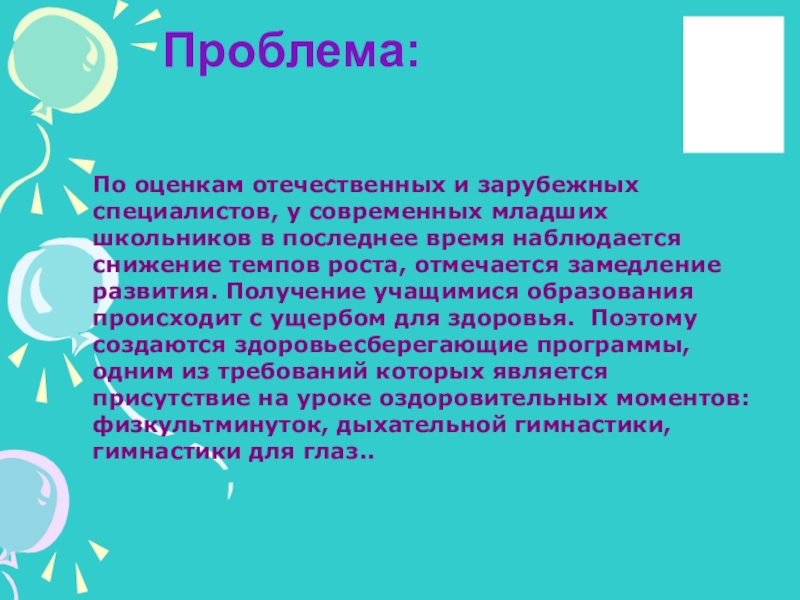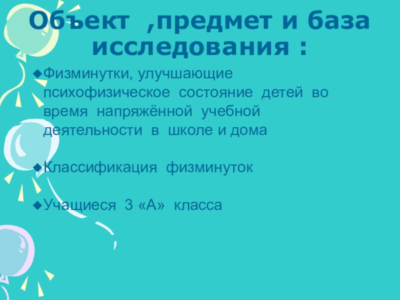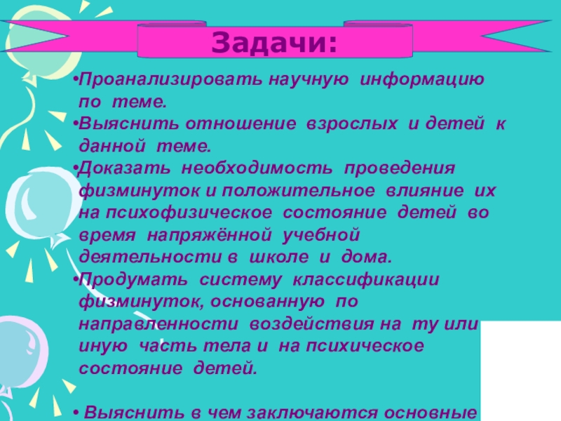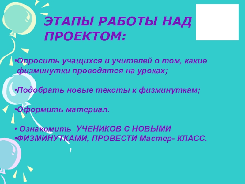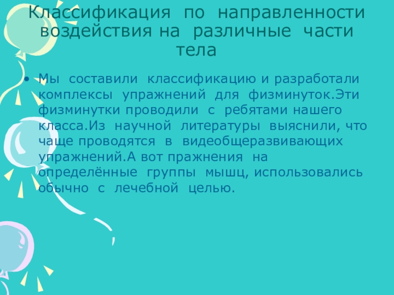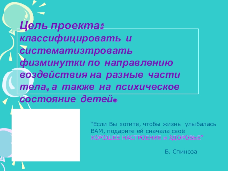 Цель проекта: классифицировать и систематизтровать физминутки по направлению воздействия на разные части тела, а также на психическое состояние детей.