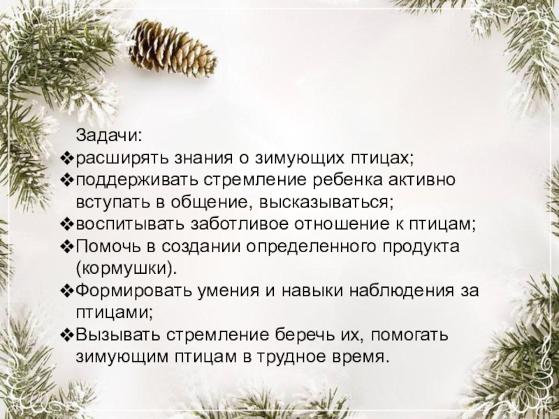 Задачи: расширять знания о зимующих птицах;поддерживать стремление ребенка активно вступать в общение, высказываться;воспитывать заботливое отношение к птицам;Помочь