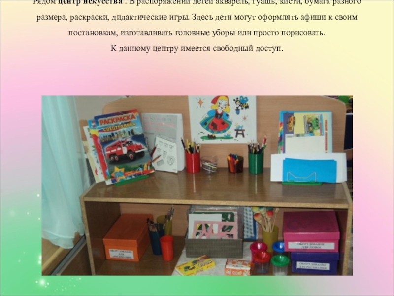 Рядом центр искусства . В распоряжении детей акварель, гуашь, кисти, бумага разного