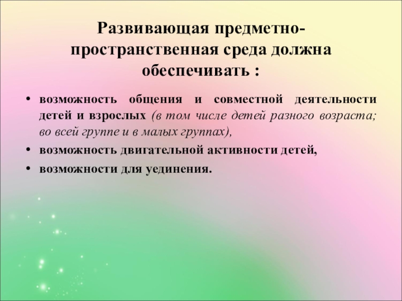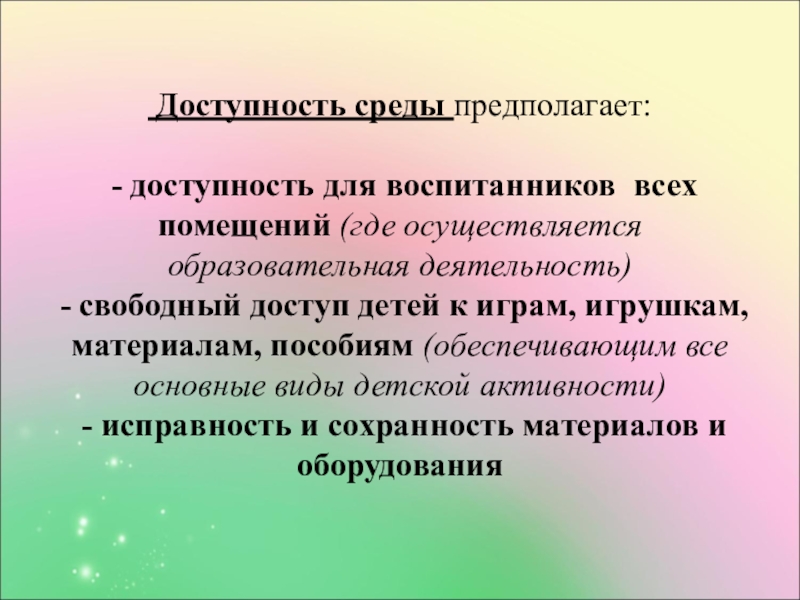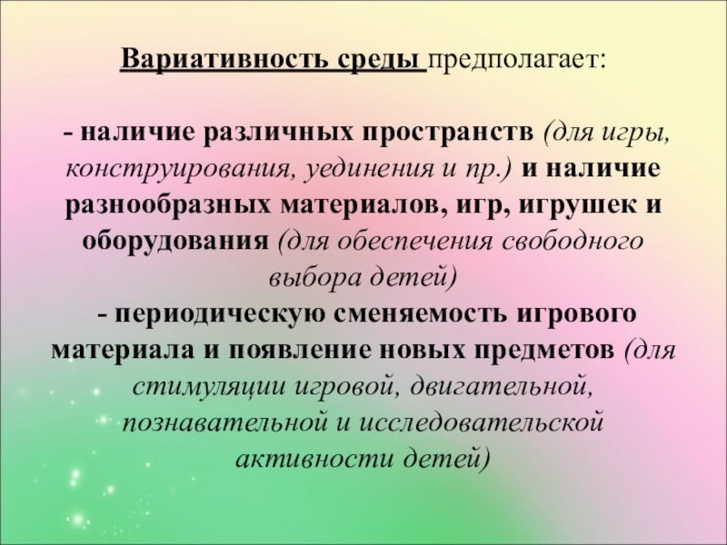 уединения и пр.) и наличие разнообразных материалов, игр, игрушек и оборудования (для обеспечения свободного выбора детей)