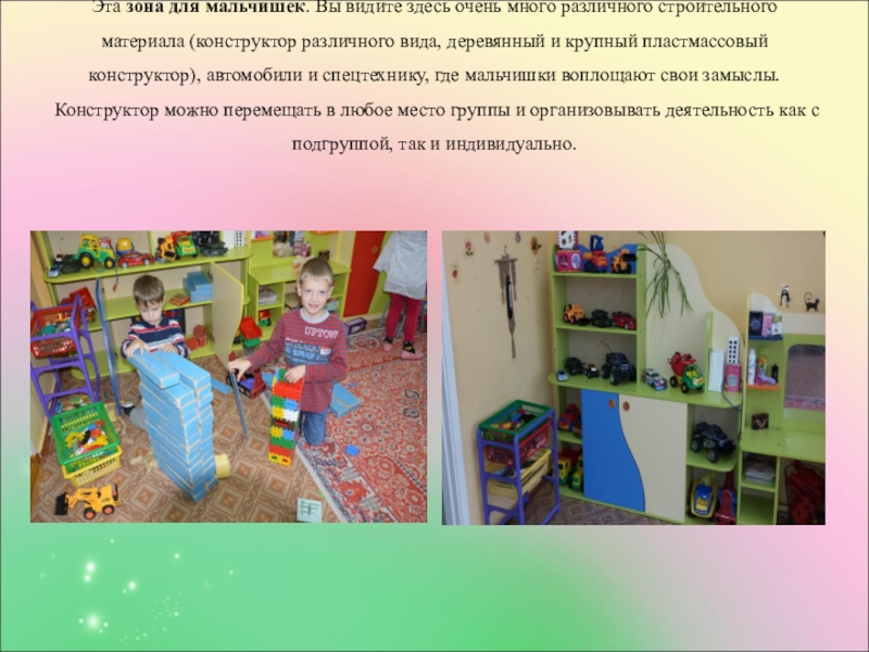материала (конструктор различного вида, деревянный и крупный пластмассовый конструктор), автомобили и спецтехнику, где мальчишки воплощают свои замыслы. Конструктор можно перемещать в любое место группы и организовывать деятельность как с подгруппой, так и индивидуально.