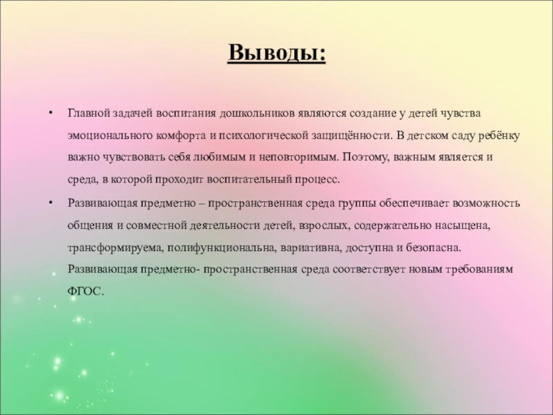 и психологической защищённости. В детском саду ребёнку важно чувствовать себя любимым и неповторимым. Поэтому, важным является и среда, в которой проходит воспитательный процесс.
